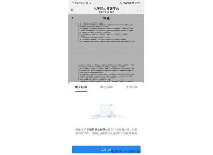 初次使用契约锁电子签章共四步:1、永青供应链合同确认;2、个人认证 3、企业认证;4、印章制作。