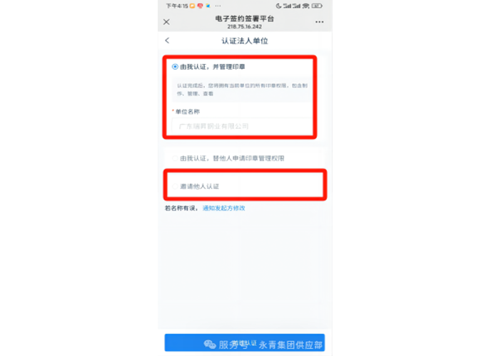 可以选择自己成为单位印章管理员(由我认证,并管理印章),也可以选择公司领导人成为单位印章管理员(邀请他人认证)。单位印章管理员就是法人的代表人,与法人权限一样(建议将单位印章管理员由领导管理)