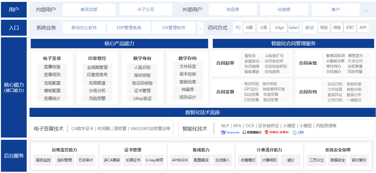 ·印章管理:提供电子印章的申请、授权、使用、废止全生命周期在线管理,实现电子印章与物理印章一体化管理。